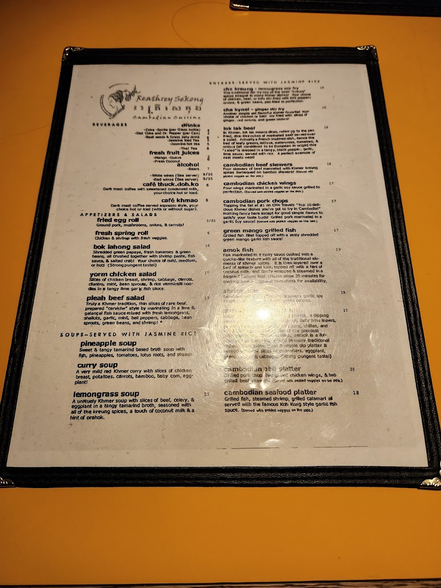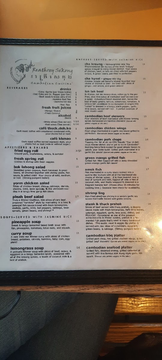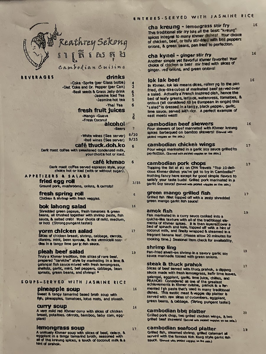The menu at Reathrey Sekong features a variety of traditional Cambodian dishes, offering a balanced selection of appetizers, noodle soups, entrees, and beverages. It is organized into clear sections that highlight the diverse flavors and ingredients typical of Cambodian cuisine.