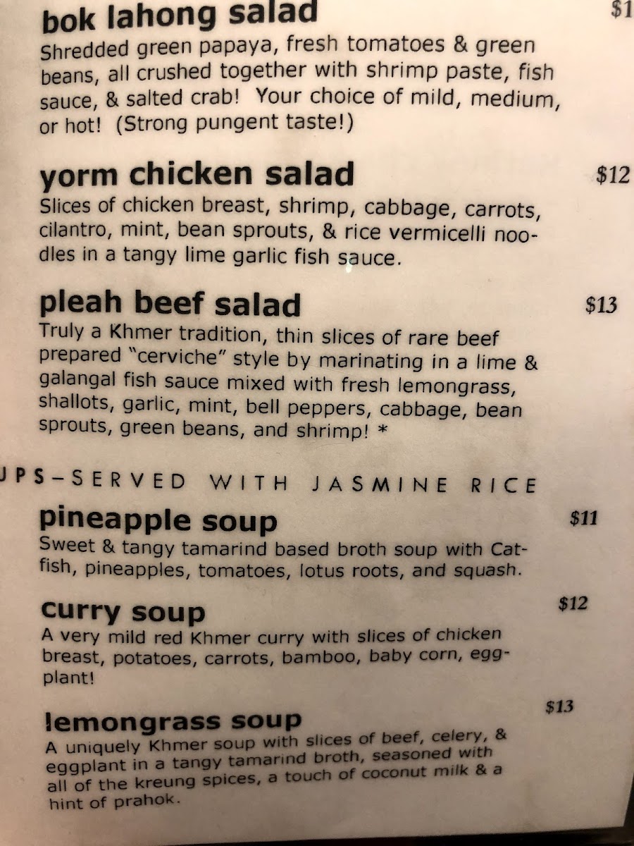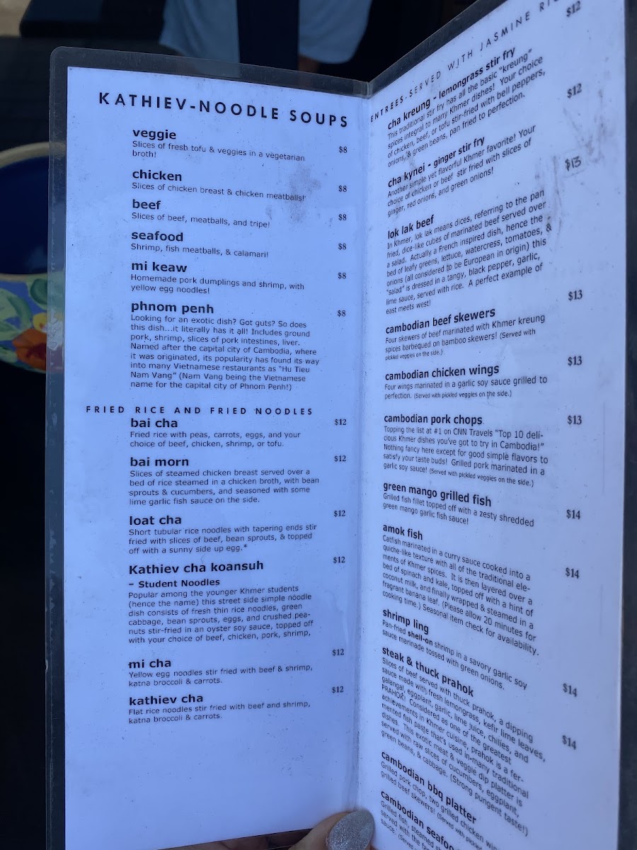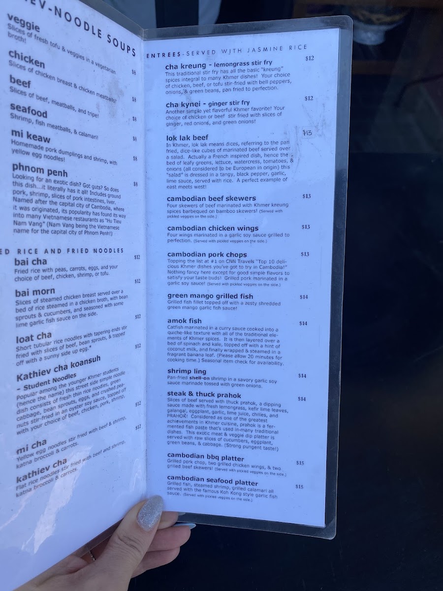 The menu is suited for casual dining, with options that cater to both light meals and more substantial orders. Visitors can expect a well-structured menu that facilitates both quick selections and leisurely meals, featuring authentic Cambodian flavors.
