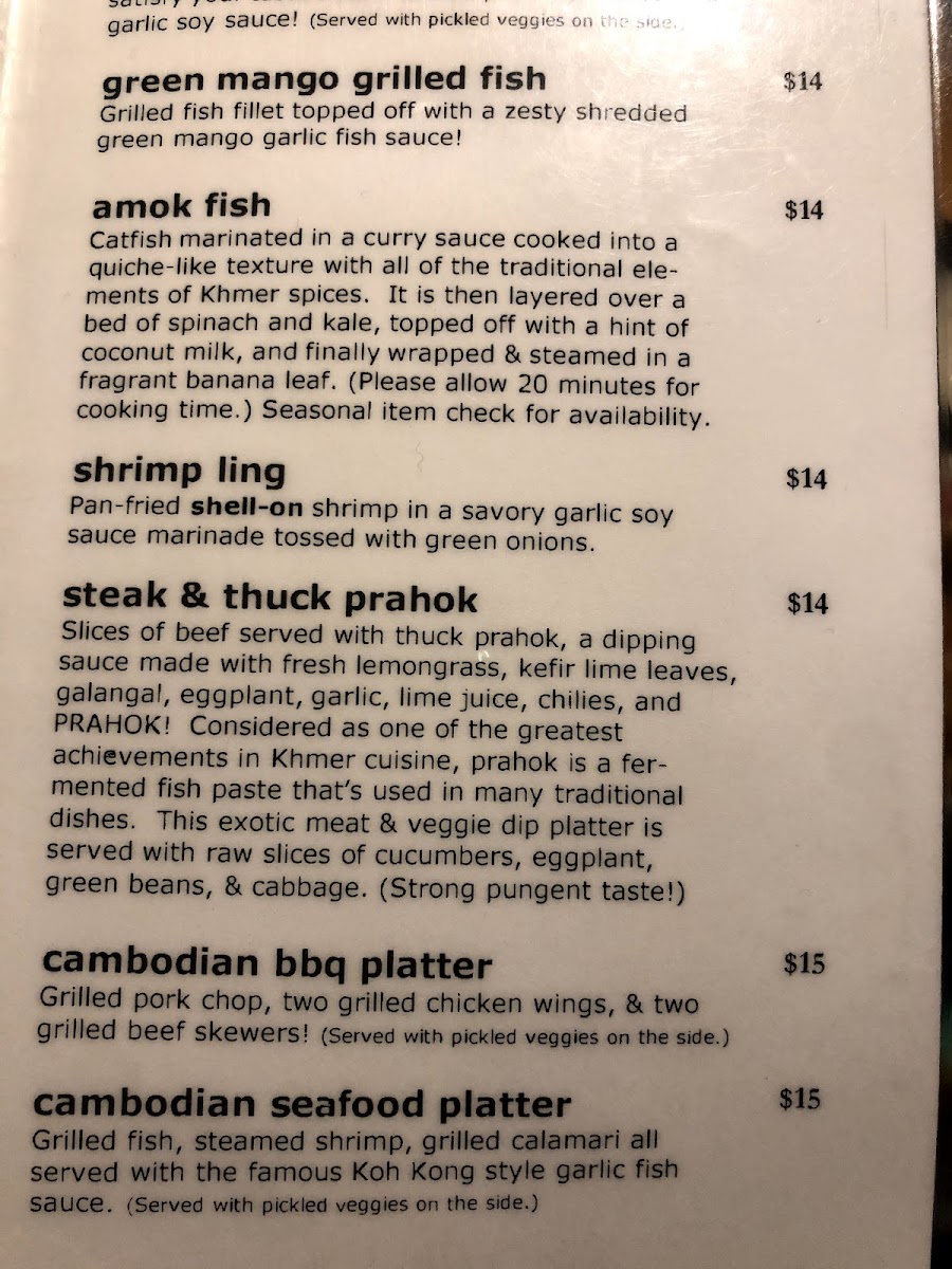 Specialty Items and Highlights include Cambodian BBQ Platters, Amok Fish wrapped in banana leaf, Lemongrass Soup, Khmer Seafood Platter, and various dishes featuring lemongrass, curry, and fresh herbs. These offer a wider variety of flavors and textures representative of Cambodian culinary traditions.