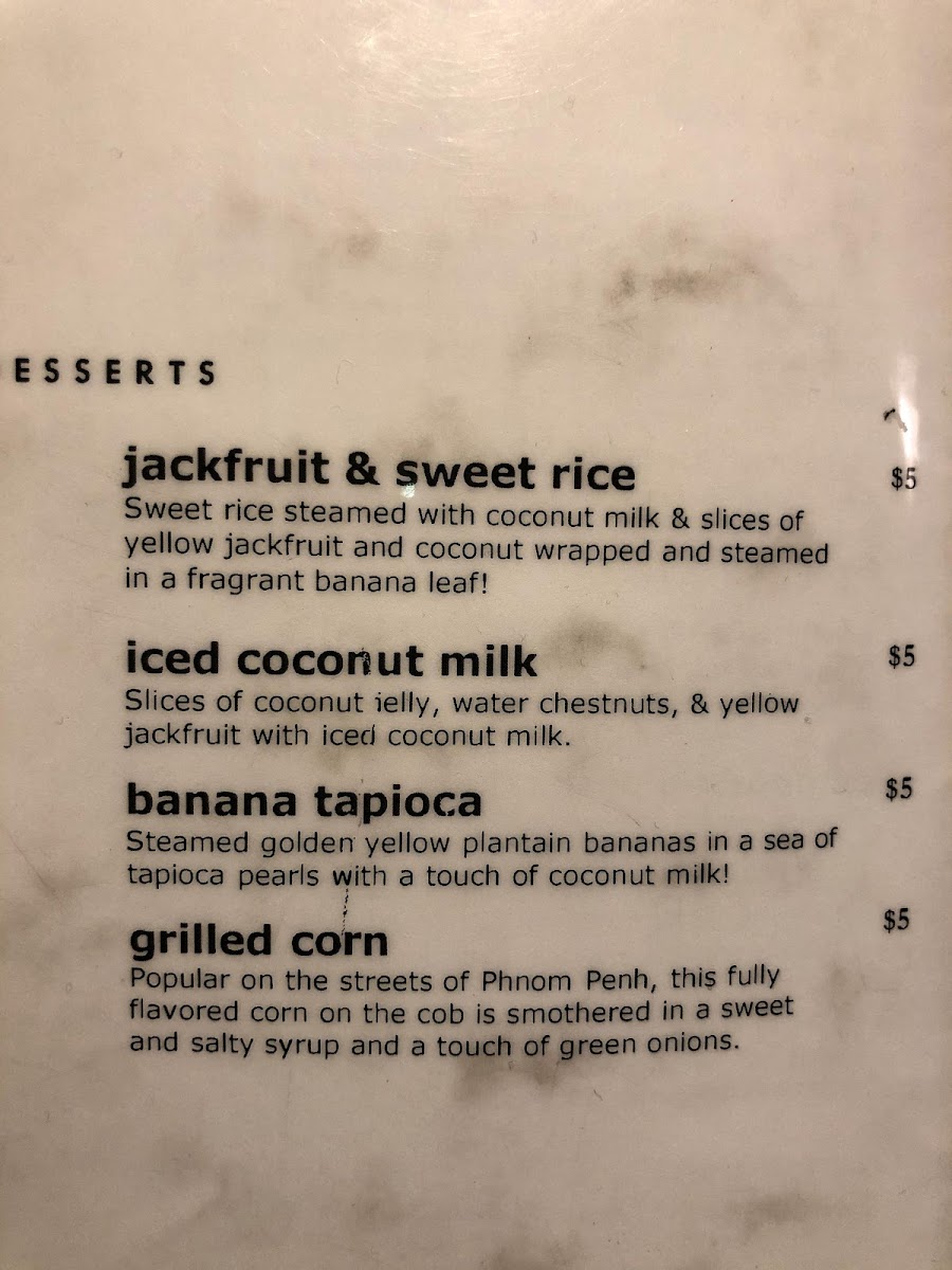 Desserts and Side Items include selections like Banana Tapioca and Jackfruit with Sweet Rice wrapped in banana leaf, providing traditional Cambodian sweet options.